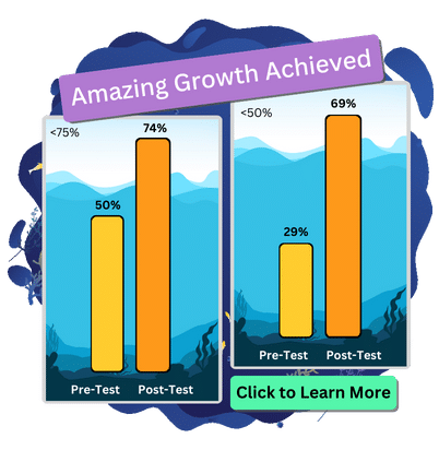 Research shows the amazing growth that students have achieved! Research demonstrates significant student growth as measured by Pre-Tests and Post-Tests aligned with TEKS. Students scoring below 75% on the pre-test experienced a 24% increase, while those scoring below 50% saw a remarkable 40% increase after using Underwater Math’s Skill Builder for adaptive remediation.